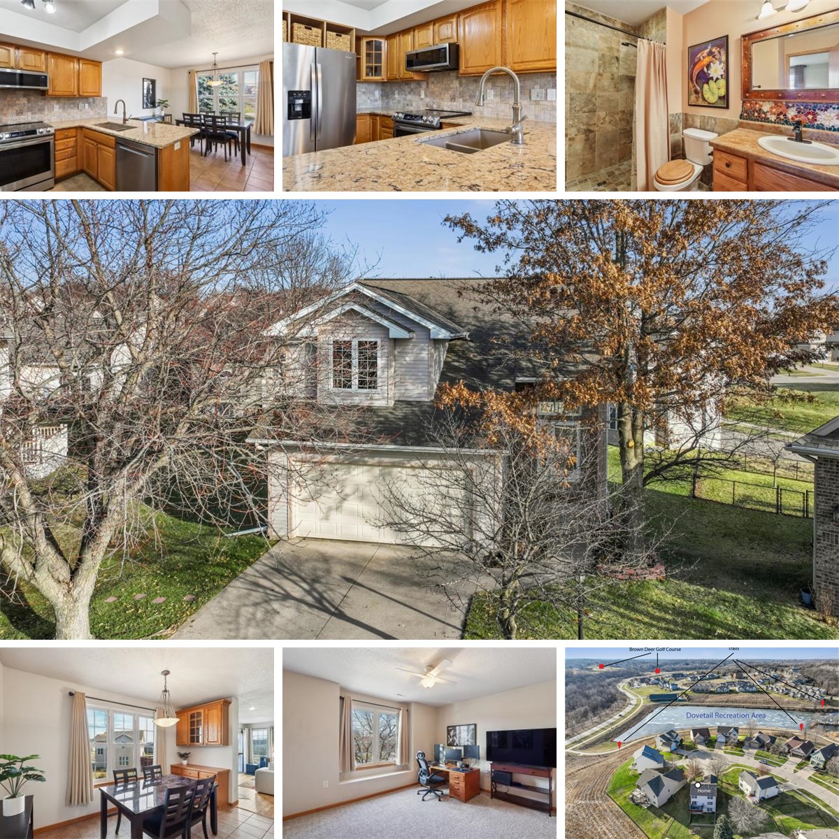 Come home to enjoy this lovely 2 story home with walkout lower level adjacent to the highly desirable Dovetail Recreation Area. Main entryway includes open staircase with vaulted ceiling, powder room, gas fireplace in the living room with 2023 new hard wood flooring, sliding glass doors opening to a generous deck for relaxing and entertaining. Enjoy the well cared for, low maintenance home with several updates including: 2023 New luxurious veined Granite Kitchen Countertop with new large stainless-steel sink and pull-down faucet, tile backsplash. 2022 Samsung stainless-steel Smart Things Stove and Microwave. 2022 stainless-steel Whirlpool refrigerator and dishwasher. Dining room has built in storage hutch, large light filled windows. Upstairs has spacious landing with a generous primary bedroom with two closets and primary bathroom has enchanting mosaic tile backsplash. 2 generous secondary bedrooms, one with window seat. Downstairs family room walks out onto patio and partially fenced space, includes another generous bedroom, bathroom and laundry room with Maytag Washer and Dryer that stay. 2020 new Richmond water heater and 2018 new Rheem furnace and Morton water softener. 2 car garage has 2023 new garage door, active radon mitigation.